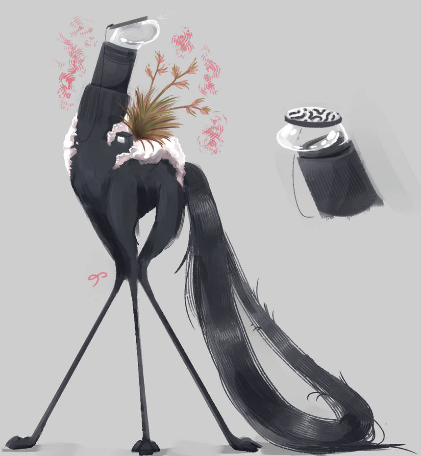 It is a very lanky esk with a black body and three skinny legs, the hind of which is shifted to its midline and turned backwards. Its neck morphs from wiry fur into hard plastic with two layers, allowing it to slide in and out like a camera adjusting its aperture. Its head is entirely made of glass. It often wears what used to be its lens cap on its head. Its tail is made of wiry fur that loops around back to the top. It has particles of red bacteria floating around it, and on its back is a crusty mix of natron and salt, as well as a clump of red oat grass.