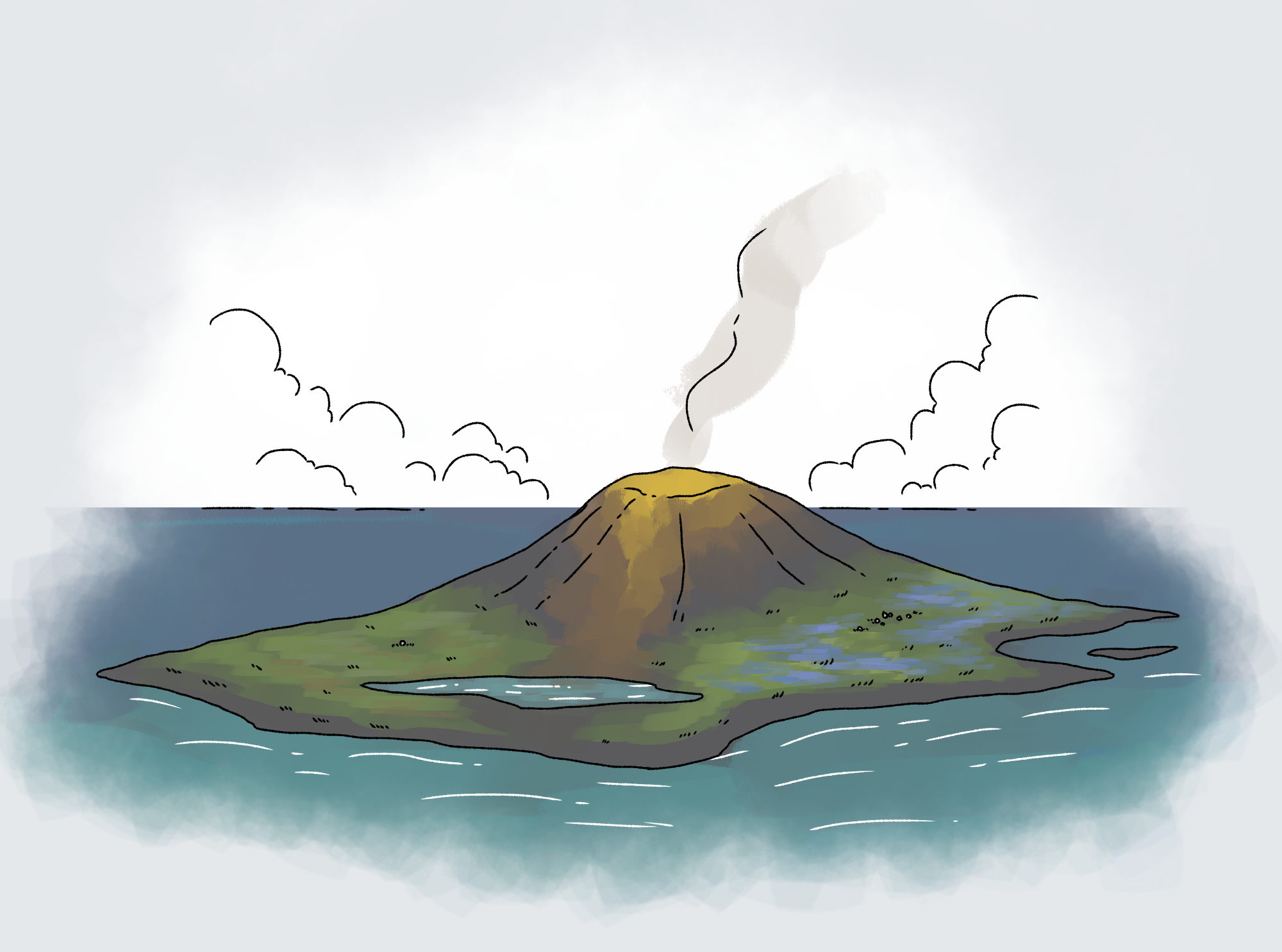 It's a little island about 5 km long, far off (but not so much so that it's completely inaccessible) from the original one. The climate is somewhat milder, but it still experiences hot summers and cold winters. There's one main raised cone as well as an impact crater that has since filled into a lake. Over the course of the story, the volcano has seemed to spit out different types of minerals.